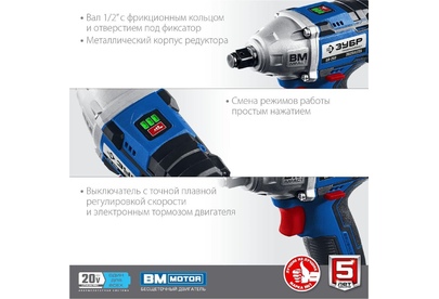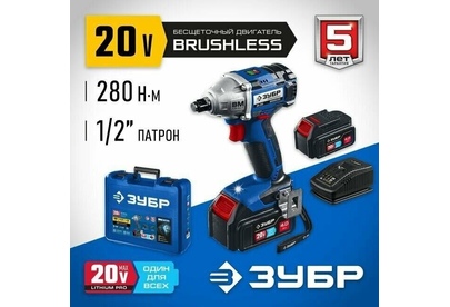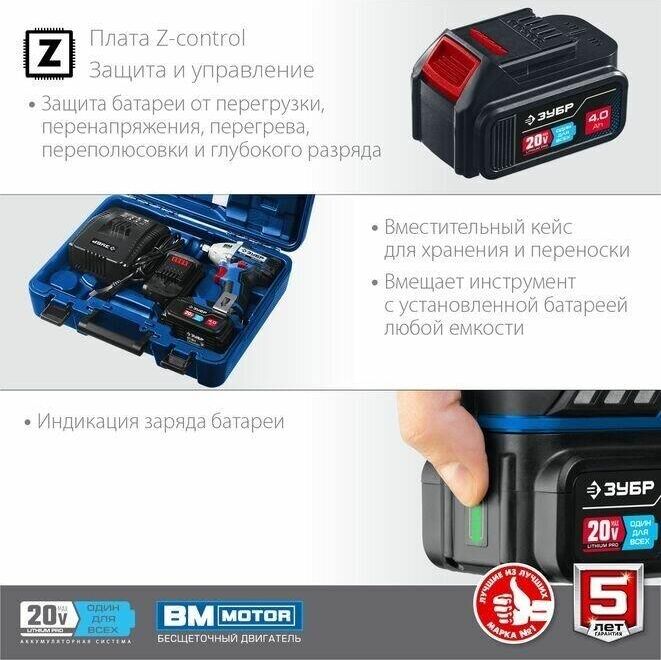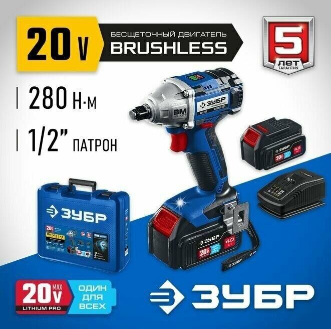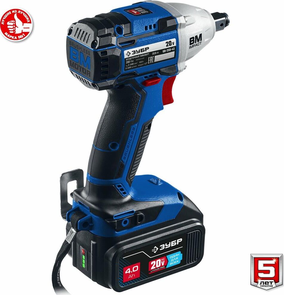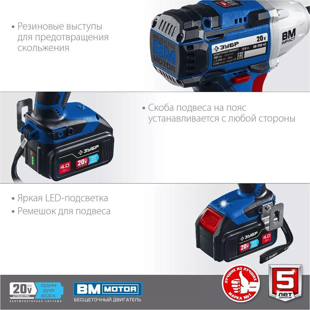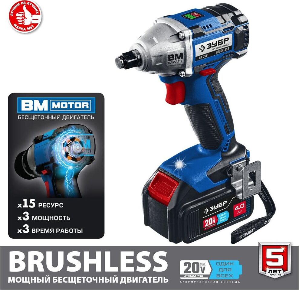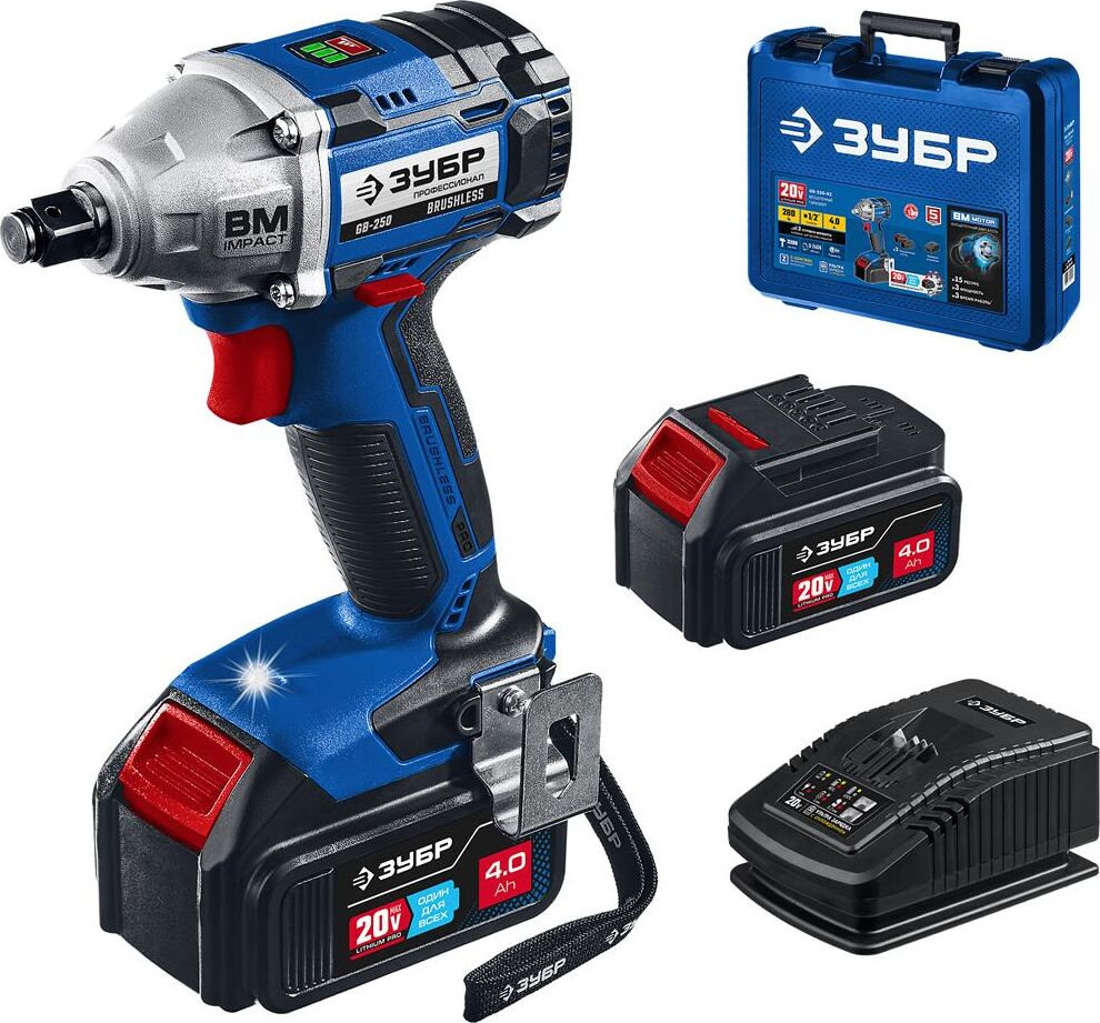 ЗУБР GB-250-42 20В бесщеточный гайковерт, 2 АКБ (4Ач), в кейсе, Профессионал