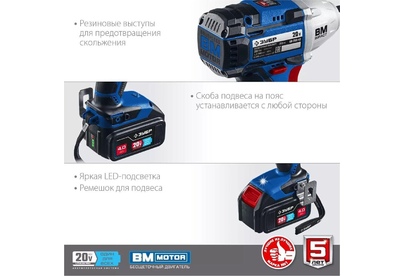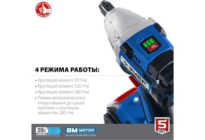 Напряжение изделия, В 20. Частота вращения шпинделя, об/мин 0-2400. Число скоростей 3. Частота ударов, уд/мин 0-3300. Максимальный крутящий момент, Н*м 280. Размеры крепежа М6-М16. Кол-во режимов крутящего момента 3. Тип аккумулятора Li-Ion. Емкость аккумулятора, А·ч 4.0. Тип патрона квадрат. Размер патрона, дюйм 1/2. Электронная регулировка частоты вращения есть. Защита от перегрузки есть. Реверс есть. Блокировка шпинделя нет. Тип двигателя BRUSHLESS, бесщеточный. Тормоз двигателя есть. Ударная функция есть. Подсветка есть. Индикатор заряда батареи нет. Количество аккумуляторов 2. Зарядное устройство импульсное. Время заряда батареи, ч 0.5. Кейс в комплекте. Напряжение питания зарядного устройства, В/Гц 230/50. Габариты, см 37x31x11. Масса изделия, кг 1.7. Масса в упаковке, кг 4.3.