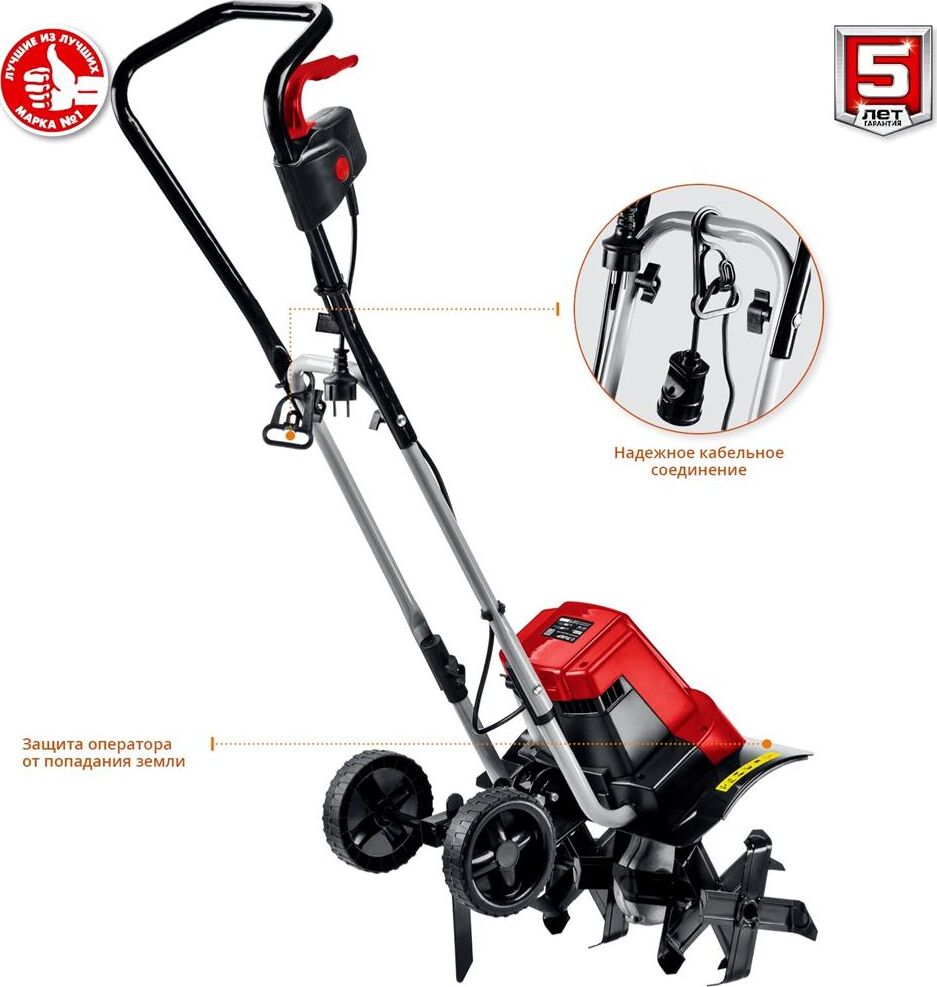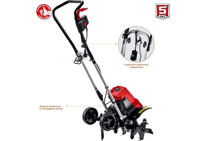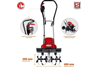 Cошник. Глубина вспашки, мм200. Тип редуктора червячный. Ширина вспашки, мм400. Число скоростей 1 вперед. Тип двигателя электрический, синхронный. Мощность, Вт1800. Масса изделия, кг11.6. Масса в упаковке, кг13.5. Габариты, см41x44x133. Колеса для перемещения.