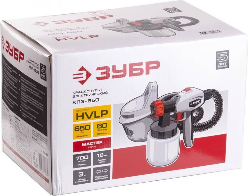Электрический краскопульт Зубр МАСТЕР КПЭ-650 предназначен для нанесения красок, лаков и иных растворимых материалов аналогичной вязкости на различные поверхности. Форма сопла регулируется, что позволяет проводить горизонтальную/вертикальную покраску, а также работать в труднодоступных местах. Технические характеристики Зубр МАСТЕР КПЭ-650 Принцип работы воздушный Способ распыления ЛКМ HVLP Вес, кг 3 Производительность, л/мин 0,7 Емкость бака, л 0,8 Диаметр сопла, мм 1,8 Max вязкость, DIN 60 Мощность, Вт 650
