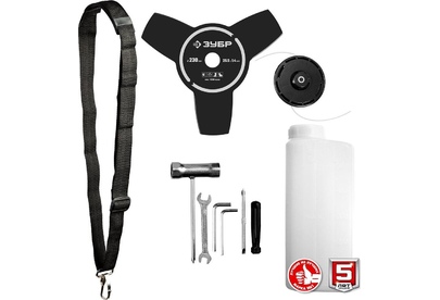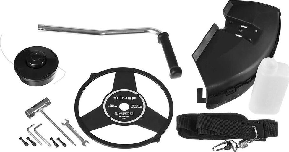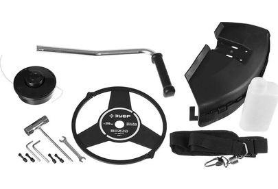 коса бензиновая 1 шт., велосипедная рукоятка 1 шт., кожух защитный 1 шт., нож 1 шт., катушка с леской 1 шт., ключ 3 шт. (свечной, гаечный, имбусовый), фиксатор вала 1 шт., плечевой ремень 1 шт., емкость для смешивания 1 шт., руководство по эксплуата