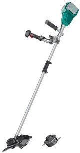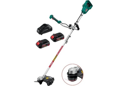 Напряжение изделия, В 36. Частота вращения шпинделя, об/мин 0-7000. Расположение двигателя нижнее. Режущий элемент леска / нож. Ширина скашивания (леска), мм 350. Ширина скашивания (нож), мм 255. Толщина лески, мм 2. Емкость аккумулятора, А·ч 2.0. Количество аккумуляторов 2. Зарядное устройство импульсное. Время заряда батареи, ч 1. Тип катушки полуавтоматическая. Тип рукоятки велосипедная. Тип штанги разъемная. Тип приводного вала - Ремень есть. Габариты, см 95х31.5х17.5.