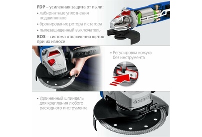 Мощность, Вт 1500. Диаметр диска, мм 125. Посадочный диаметр, мм 22.2. Число оборотов, об/мин 3000-9500. Электронная регулировка оборотов есть. Резьба шпинделя М14. Плавный пуск есть. Поддержание постоянных оборотов под нагрузкой есть. Защита от перегрузки есть. Отключение питания при заклинивании диска есть. Защита от непреднамеренного пуска нет. Регулировка положения кожуха без инструмента есть. Защита от повреждения коллектора есть. Фиксация кнопки включения есть. Дополнительная рукоятка есть. Антивибрационная основная рукоятка нет. Поворотная голова есть. Поворотная основная рукоятка нет. Суперфланец есть. Быстрозажимная гайка sds нет. Длина кабеля, м 3. Напряжение, В/Гц 220-240/50. Габариты, см 40х15х11.