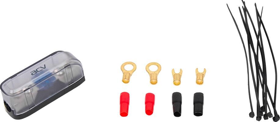 Заземляющий кабель Длина заземляющего кабеля: 1 м Силовой кабель Длина силового кабеля: 5м Толщина жилы силового кабеля: 0,20 х 27 мм Толщина нити силового кабеля: 0,20 мм Особенности модели Материал проводника: омедненный алюминий Общие характеристики Клеммы: Круглые 8AWG – 2 шт, вилочные клеммы 8AWG -2шт Держатель предохранителя: Mini ANL + предохранитель Mini ANL 60А Диапазон рабочих температур: -40 +65 С Межблочный кабель Длина межблочного кабеля: 5 м Толщина жилы межблочного кабеля: 0,12 х 30 мм Толщина нити межблочного кабеля: 0,12 Наружный диаметр межблочного кабеля: 3.8 мм Характеристики Тип Установочный комплект