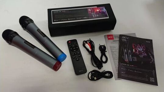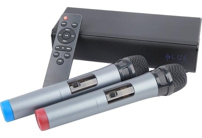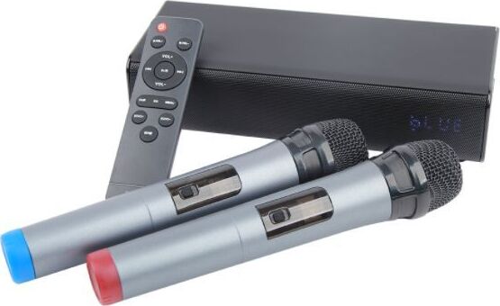 Выходная мощность (RMS): 20 Вт (стерео), Пиковая мощность: 100Вт, Тип аккумуляторной батареи: литий-полимерный (3,7В / 4000мАч), Время зарядки аккумуляторной батареи: 3 часа (при 5В / 1A), Время работы от аккумуляторной батареи: до 5 часов (зависит от громкости и аудио-контента), Источник постоянного тока: 5В / 1А, Эффективный рабочий диапазон частот: 45 Гц - 20 кГц, Диаметр динамиков: 2" (5см) x 2, Соотношение сигнал-шум: >90дБ, Версия Bluetooth 5.0 + EDR, A2DP, AVRCP, Радиус действия Bluetooth: до 10 м, Дальность действия микрофонов: до 40 метров. Размеры устройства: 250*95*60мм, Рабочая температура: от -5 до +60 °C, Вес: 0,95кг, Универсальный караоке-саундбар представляет собой коммутационно-усилительный блок с модулями преобразования и обработки звуковой информации, позволяющий осуществлять функцию караоке с двух беспроводных радиомикрофонов. Система оснащена функцией Bluetooth колонки номинальной мощностью 20 Вт (10Вт*2).