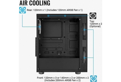 Отсеки 3,5" внутренние: 2. Фронтальные разъемы USB 2.0: 2. Фронтальные аудио-разъемы: есть. Материал корпуса: сталь/стекло. Боковая панель: прозрачная. Типоразмер: Midi-Tower. Вес корпуса: 5.81. Внутренняя корзина для HDD: съемная. Расположение БП: нижнее. Толщина стенок корпуса: 0.5. Максимальная длина видеокарты: 325. Отсеки 2,5" внутренние: 3. Фронтальные разъемы USB 3.0: 1. Количество слотов расширения: 7. Наличие блока питания: отсутствует. Фронтальная панель: прозрачная. Для геймеров: да. Максимальная высота кулера процессора: 164. Материал прозрачной боковой панели: закаленное стекло. Материал прозрачной передней панели: закаленное стекло. Габариты упаковки (ед) ДхШхВ: 0.48x0.25x0.43. Вес упаковки (ед): 5.8. Возможность установки СВО 120 мм: ДА. Возможность установки СВО 240 мм: ДА. Общее кол-во установленных вентиляторов: 3. Подсветка корпуса: есть. Тип подсветки: ARGB. Фиксация боковых панелей: винты. Форм-фактор БП: ATX. Гарантия: 12 мес.. Вентиляторы на передней панели: 2x200 мм. Вентиляторы на зад