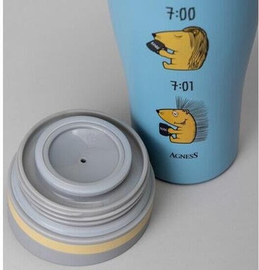 Термокружка AGNESS - незаменимый помощник в повседневной жизни. Будь это дальняя поездка, обычная прогулка или просто рабочий день в офисе - любимый напиток всегда с собой. Двойные стенки из нержавеющей стали, благодаря технологии вакуумной термоизоляции, сохраняют напитки холодными или горячими в течение долгого времени. Дополнительная медная прослойкой между 2-мя стенками, увеличивает термоизоляцию на 10%. Герметичная крышка с кнопкой-стоппером. Используя кнопку стоппер Вы легко можете открыть термокружку одной рукой, что особенно удобно в дороге. Термокружку AGNESS удобно брать с собой, она легко поместиться в сумку или рюкзак.Не мыть в посудомоечной машине. Рекомендована ручная мойка. Термокружка считается годной, если после 6 часов хранения остаточная температура воды в ней будет около 60 С° (+/- 5 С°). Начальная температура воды должна быть 98-100 С°. Испытания должны проводится при комнатной температуре 21 С°