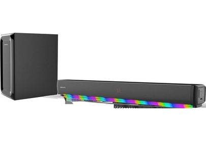 2.1 Саундбар с LED подсветкой и беспроводным сабвуфером, 450Вт Максимальная выходная мощность, 90 Вт Выходная мощность RMS, сопротивление 4Ом, 6.5" Беспроводной сабвуфер Разноцветная LED подсветка звуковой панели с 7-ю режимами работы, Беспроводная передача сигнала по Bluetooth, Цифровой HDMI (ARC) и Optical вход, Аудио форматы: MP3/WMA/FLAC/WAV, LED дисплей, Пульт управления, Поддержка воспроизведения с USB накопителя, Линейный вход, Размер звуковой панели: 941 x 80 x 88 мм, Размер сабвуфера: 192 x 310 x 375 мм