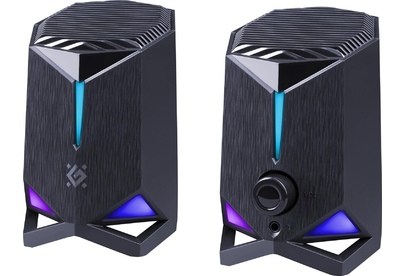 Геймерские компьютерные колонки со светодиодной подсветкой. На передней панели расположен регулятор громкости со встроенным выключателем и разъем для подключения наушников.