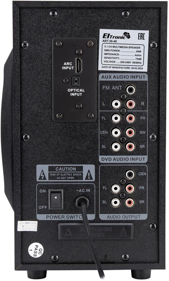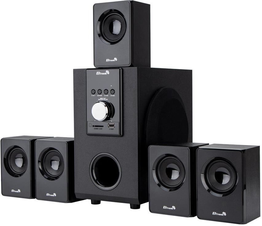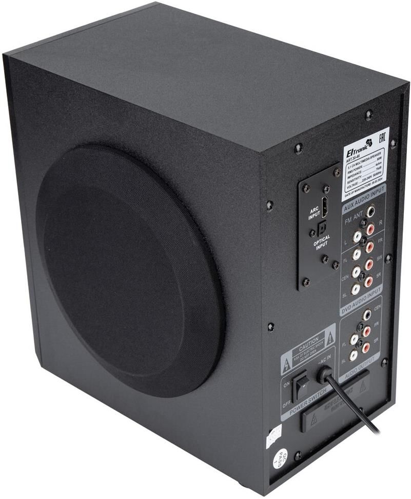 "Акустическая система 5.1 ELTRONIC HOME SOUND Режимы воспроизведения: - Bluetooth - Внешний накопитель - Aux, HDMI ARC, Optical - FM Мощность: - RMS 80 Ватт - PMPO 800 Ватт Питание: - Сеть 220V Разъемы: - USB - SD - Auх тюлпан - ARC in - Optical in Комплектация: - Комплект соединительных проводов - Пульт Д/У - Инструкция на Русском языке Размер упаковки: Ширина - 34 см Высота - 29 см Глубина - 31 см Вес-5,9 кг Дополнительно: Встроенный MP3 плеер Управление плеером прямо на колонке Led дисплей"