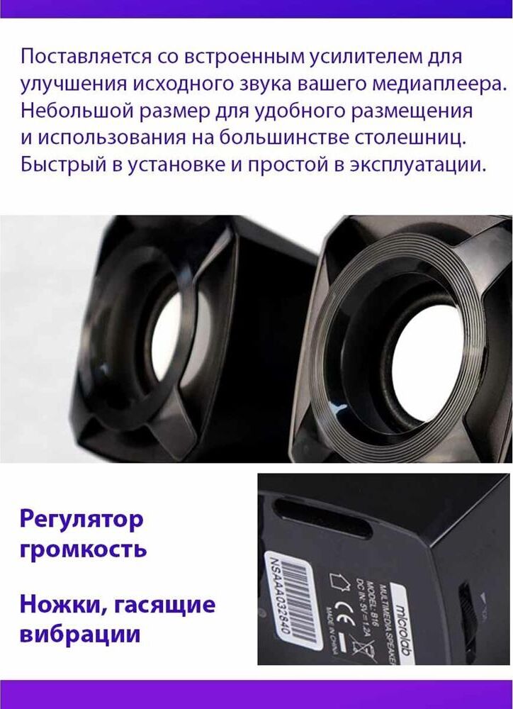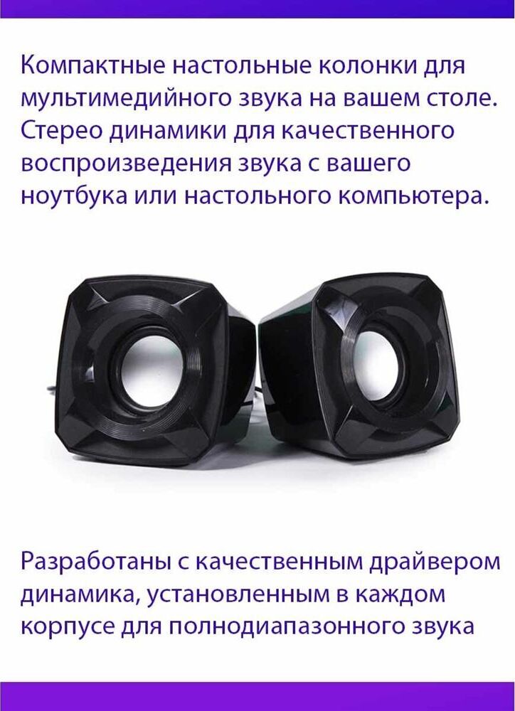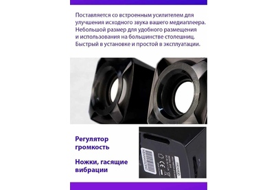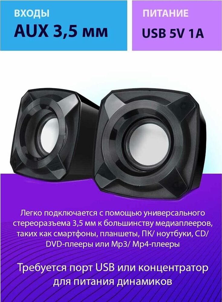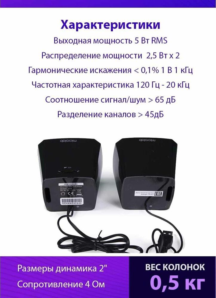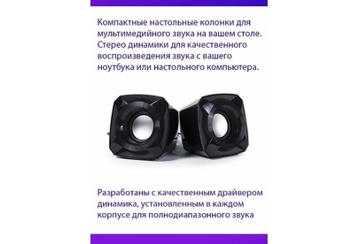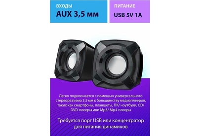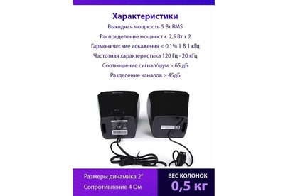 2.0, Выходная мощность 5 Вт RMS (2,5 Вт х 2) Гармонические искажения 65 дБ Разделение каналов > 45дБ Размеры динамика 2 Сопротивление 4 Ом Питание USB port Вход 3.5 mm stereo