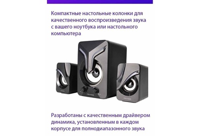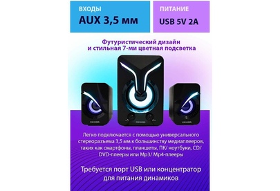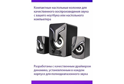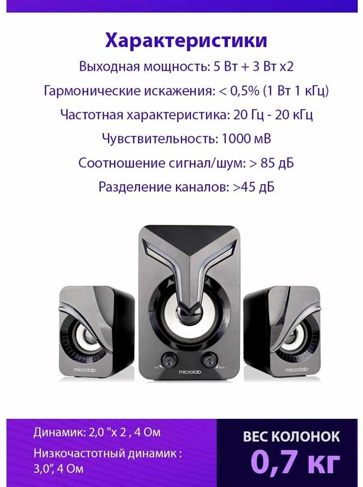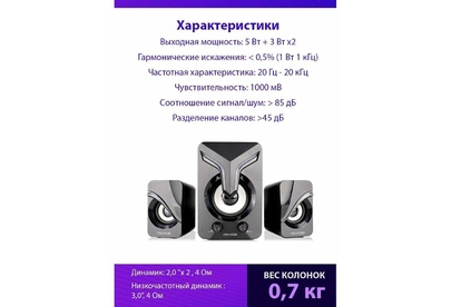 2.1, Выходная мощность: 5 Вт + 3 Вт x2 Гармонические искажения: 85 дБ Разделение: >45 дБ Колонки: Драйвер динамика: 2,0 x 2,4 Ом Низкочастотный динамик: 3,0”, 4 Ом Интерфейсы: Вход: 3,5 мм стерео Вход постоянного тока: USB 5V 2A Размеры сабвуфера: 106 Вт x 128 D x 161 H мм Размеры сателлита: 61 Вт x 82 D x 97 H мм