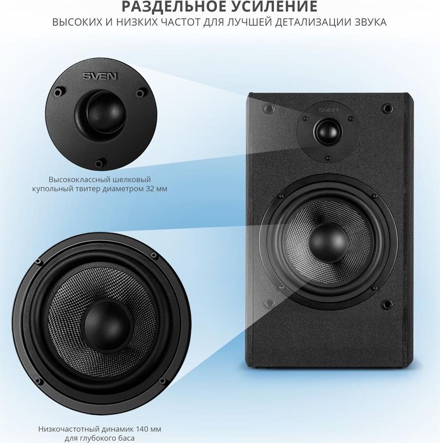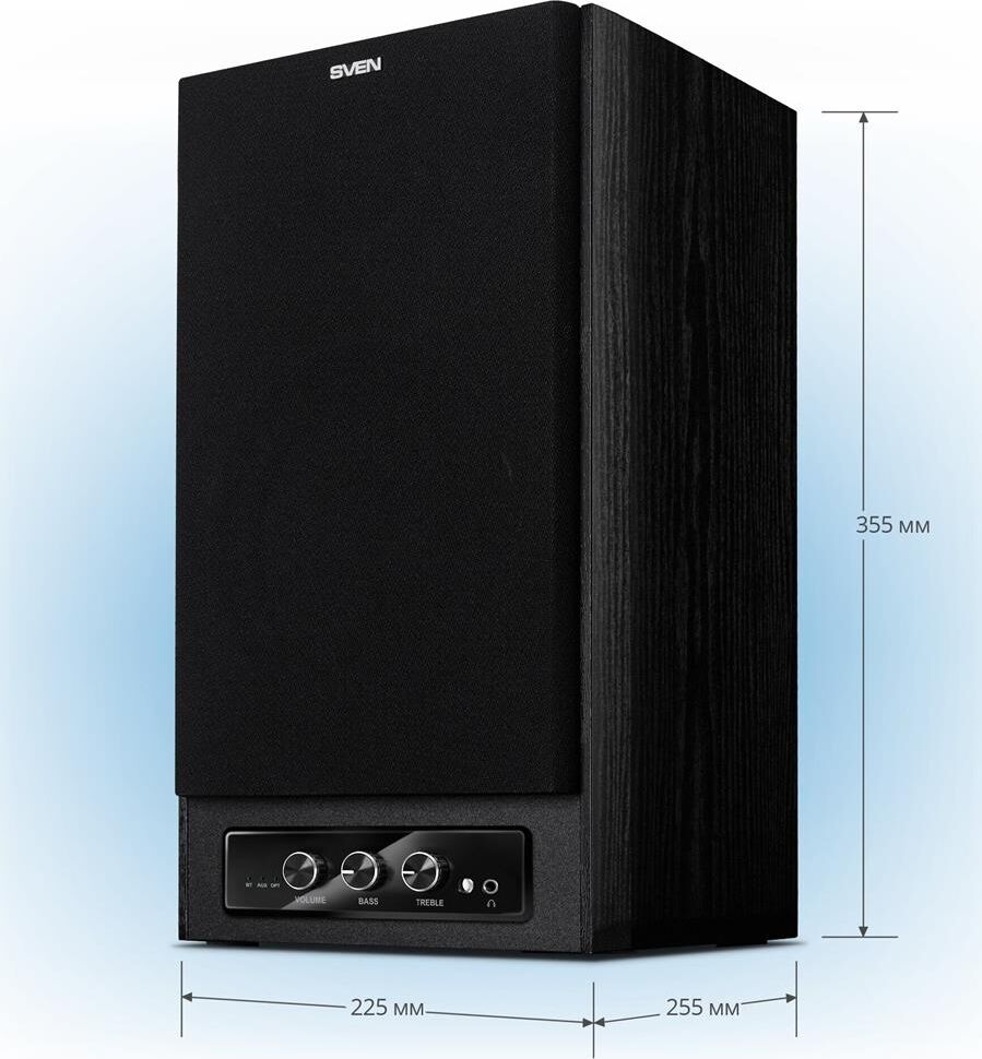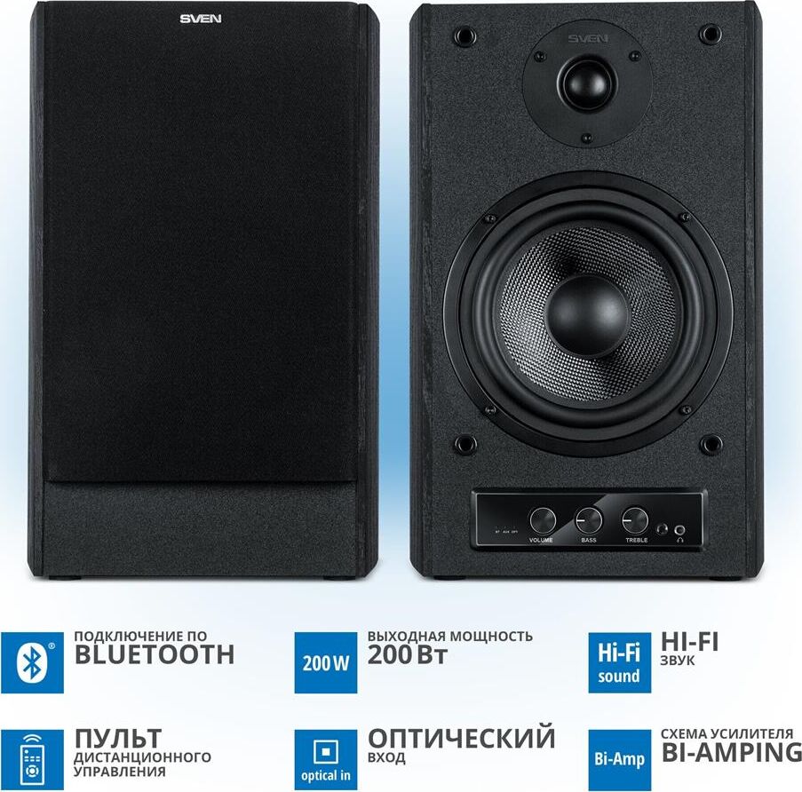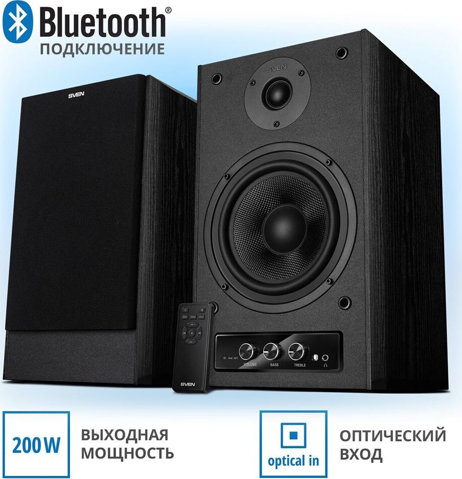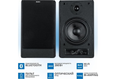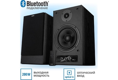 Акустическая система, Bluetooth, выходная мощность (RMS), Вт 200 (2 х100), частотный диапазон, Гц - 30 – 27 000, диаметр ВЧ-динамиков, мм O 32, типы входов - 2 RCA, материал корпуса дерево (MDF), размеры изделия, мм - 225х255х355.