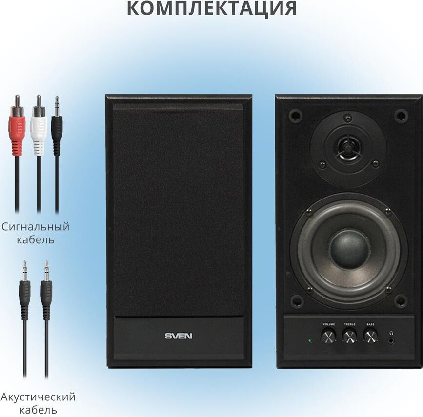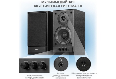 Акустическая система, выходная мощность (RMS), Вт 40 (2 х20), частотный диапазон, Гц 40 – 22 000, диаметр ВЧ-динамиков, мм O 19, диаметр НЧ-динамиков, мм O 100, напряжение питания ~220 В, 50 Гц, материал корпуса - дерево (MDF), встроенный трансформаторный источник питания, управление настройками - на передней панели, размеры изделия, мм - 143х265 х150.