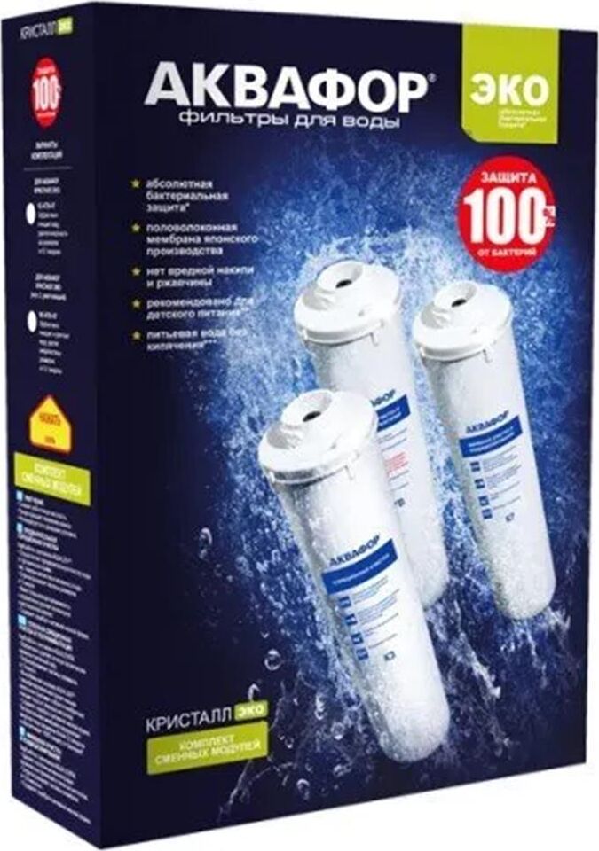 Количество в комплекте: 3. Совместимость: Аквафор Кристалл ЭКО. Назначение: для проточных фильтров. Особенности: Обеззараживает воду. Не снижает жесткость воды.. Вес упаковки (ед): 1.95. Количество: 3 шт. Назначение: для проточных фильтров. Совместимость: Аквафор Кристалл ЭКО