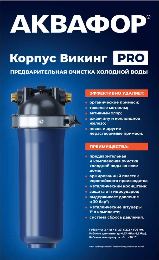 Предварительная и комплексная очистка холодной воды во всей квартире или загородном доме. Габариты Д/Ш/В 247/228/459мм. Вес 3,29кг. Преимущества: • Армированный пластик европейского производства. • Легкая замена модуля без специальных инструментов. • Металлический кронштейн. • Защита от гидроударов. • Выдерживает давление в 30 бар* • Удобное быстроразъёмное подключение — «американка». Наружная резьба 3/4” • Система сброса давления.