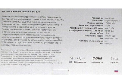 Антенна комнатная цифровая PF-TV3214 «PLANE» предназначена для приема телевизионных программ в полосе частот 174..862 МГц, а также принимает сигналы аналогового и цифрового телевидения формата DVB-T и DVB-T2. Обеспечивает прием сигналов телевидения в зоне уверенного приема Устанавливается на телевизоры с креплением FDMI VESA, корпус цифрового приемника (ресивера), на окно или любую подходящую поверхность с помощью специального адгезивного слоя
