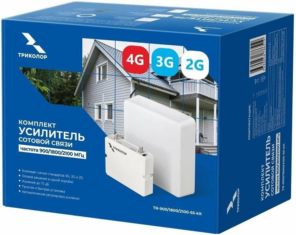 Комплект предназначен для усиления сигнала мобильного интернета и голосовой мобильной связи сразу в трех диапазонах: 900, 1800 и 2100 МГц. Приёмная антенна на улице передает сигнал по кабелю на репитер сотовой связи. Слабый сигнал усиливается и распространяется в помещении внутренней антенной.