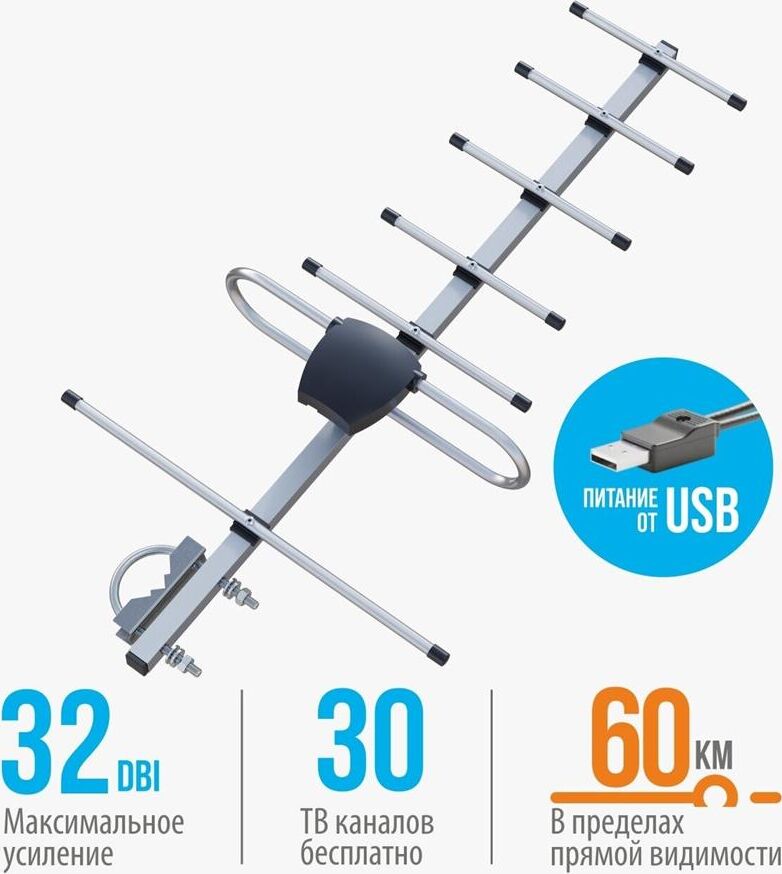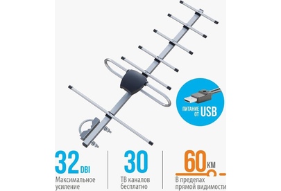 Наружная семиэлементная активная алюминиевая ТВ антенна ДМВ/DVB-T2. Укомплектована двухкаскадным усилителем. Коэффициент усиления - 29 Дб. Поставляется в пакете.