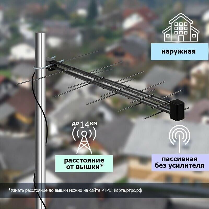 Антенна индивидуальная уличной установки, предназначена для приема цифрового эфирного ТВ вещания в стандарте DVB-T2. Используется для приема цифрового эфирного вещания на телевизорах или комбинированных ресиверах, укомплектованных тюнером стандарта DVB-T2. Характеристики: - Установка антенны: Уличная; - Назначение: для приёма цифрового эфирного ТВ вещания; - Рекомендуемое расстояние до телепередатчика: до 14км; - Коэффициент усиления: 10 дБи; - Волновое сопротивление: 75 Ом; - Усилитель и блок питания: нет; - Размеры в сборе: 670х310х50 мм; - Масса: 0,75 кг - Тип подкл: F- коннектор - Тип упаковки: пакет; - В комплекте: аненна, инструкция по сборке и подключению. Дополнительная информация: Посмотреть зону покрытия цифрового ТВ (DVB-T2), или определить удаленность Базовой Станции (телецентра) от вашего района или населенного пункта можно на официальном сайте РТРС: http: //карта.ртрс.рф