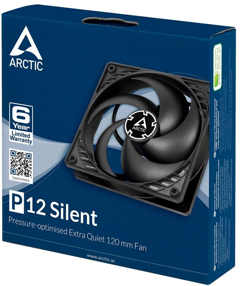 **Вентилятор Arctic Cooling P12 Silent** — это высококачественный корпусной вентилятор, который обеспечивает эффективное охлаждение компьютера. Он имеет следующие характеристики: * Размеры вентилятора: 120 x 120 мм. * Скорость вращения: 800–1800 об/мин. * Воздушный поток: до 56 CFM. * Уровень шума: не более 22,5 дБ. Вентилятор оснащён гидродинамическим подшипником, который обеспечивает долгий срок службы и низкий уровень шума. Вентилятор имеет чёрную окраску корпуса и лопастей, что делает его стильным дополнением к любому компьютеру. **Преимущества вентилятора Arctic Cooling P12 Silent:** 1. **Тихая работа.** Благодаря низкой скорости вращения и гидродинамическому подшипнику, вентилятор работает очень тихо, обеспечивая комфортное использование компьютера. 2. **Эффективное охлаждение.** Вентилятор обеспечивает мощный воздушный поток, который эффективно охлаждает компоненты компьютера, предотвращая их перегрев. 3. **Долговечность.** Гидродинамический подшипник обеспечивает длительный срок службы вентилятора без