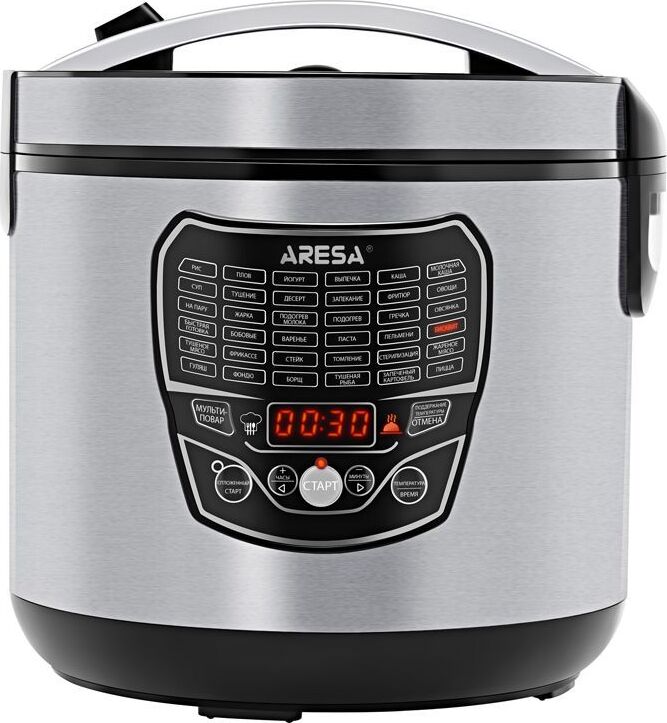 ARESA AR-2010 Мощность: 790-930 Вт Съёмная чаша (объём 5 л) 36 программ "Рис, Суп, На пару, Быстрая готовка, Тушеное мясо, Гуляш, Плов, Тушение, Жарка, Бобовые, Фрикассе, Фондю, Йогурт, Десерт, Подогрев молока, Варенье, Стейк, Борщ, Выпечка, Запекание, Подогрев, Паста, Томление, Тушеная рыба, Каша, Фритюр, Гречка, Пельмени, Стерилизация, Запеченый картофель, Молочная каша, Овощи, Овсянка, Бисквит, Жареное мясо, Пицца " Программа «Поддержание температуры» Программа «Мультиповар» (при температуре 100°С задаётся время от 2 мин до 15 часов) Регулировка времени и температуры приготовления Функция отложенного старта (установка таймера до 24 ч) LED дисплей Защита от перегрева Прочный корпус из нержавеющей стали Ручка для переноски