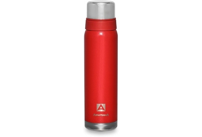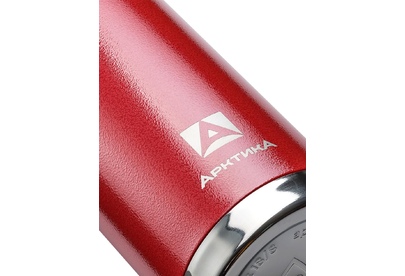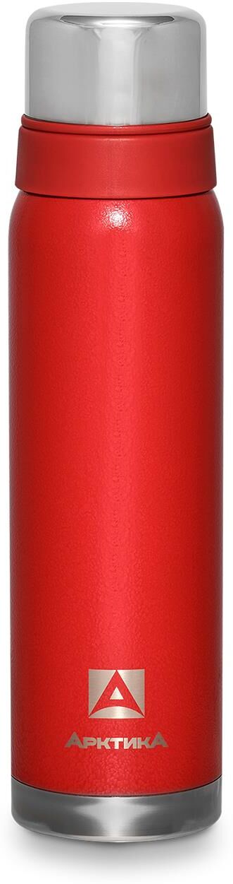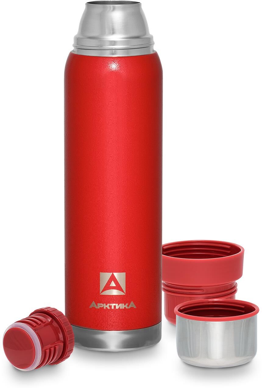Термос с узким горлом и глухой пробкой, 2 накручивающиеся чашки в комплекте. Молотковая эмаль на корпусе дополнительно защищает термос от сколов и царапин. Объем 0,9 л.