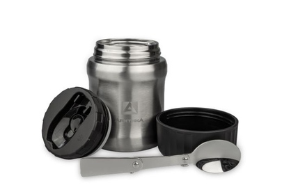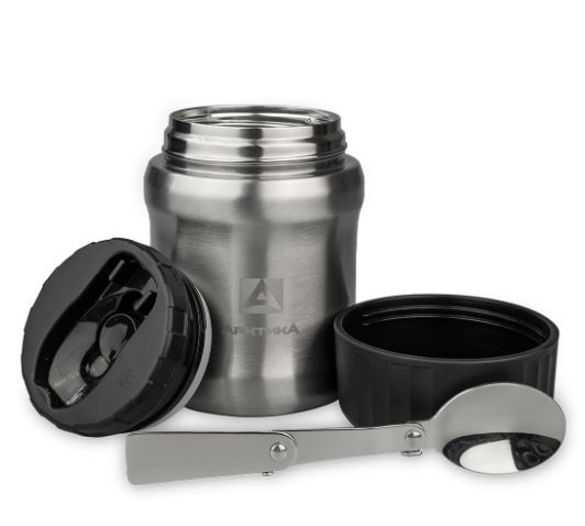 Термос для еды вакуумный, бытовой, тм «Арктика», 0.5 л, В комплект входит вместительная крышка-тарелка и складная ложка. Пробка оснащена кнопкой спуска избыточного давления в термосе. Самая легкая и компактная модел