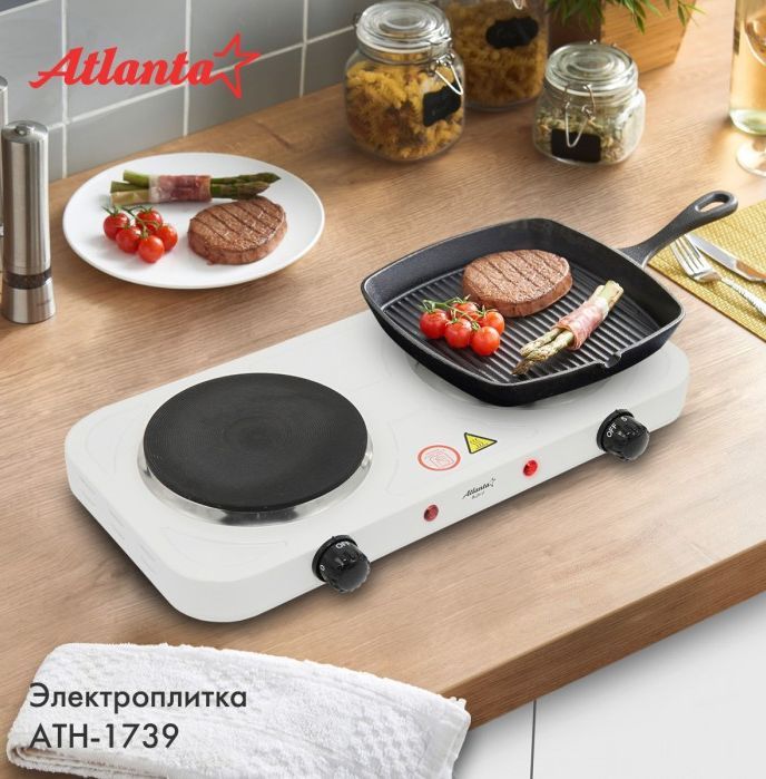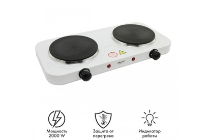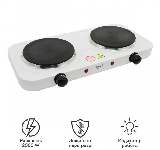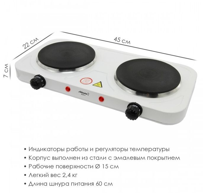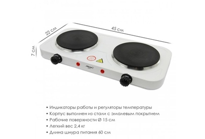 Номинальная мощность 2000 Вт Чугунный ТЭНы 15 + 15 см Регулятор температуры Индикатор работы Защита от перегрева Кабель питания 60 см 230 B ~ 50 Гц