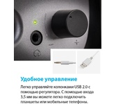 Акустическая система 2.0, выходная мощность (RMS), Вт 6 (2 х 3), частотный диапазон, Гц - 100 – 20 000, размеры динамиков, мм - O 53, напряжение питания USB / DC 5V, материал корпуса - дерево (MDF), регулировка уровня громкости, разъемы для подключения наушников и микрофона.