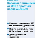Поворотная ручка регулировки уровня громкости на передней панели Функция отключения питания Питание через порт USB Деревянный корпус (MDF) Выходная мощность (RMS), Вт 6 (2 ? 3) Частотный диапазон, Гц 100 – 20 000 Размеры динамиков, мм O 60 Напряжение питания USB / DC 5V Номинальный ток потребления, А 0,03