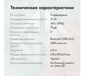 Акустический тип 2.0 Тип беспроводного подключения Bluetooth Тип электропитания от сети Суммарная звуковая мощность 60 Вт Частотный диапазон 40 Гц - 20 КГц Отношение сигнал/шум 75 дБ Фронтальные АС Мощность фронтальных колонок 2 х 30 Вт Количество полос фронтальных колонок двухполосные Размер широкополосного динамика (фронт) 101,5 мм Размеры ВЧ динамика (фронт) 25.5 мм Количество СЧ динамиков (фронт) 2 Особенности Пульт ДУ беспроводной Разъемы и интерфейсы Расположение регуляторов на передней панели Разъем USB 1 Стерео-вход AUX INPUT есть Корпус акустической системы Материал корпуса колонок (фронт) MDF/пластик Размер фронтальных колонок (ШхВхГ) 152 х 243 х 215 мм Общий вес 6 кг Основной цвет черный Упаковка Габариты упаковки (ед) ДхШхВ 0.37x0.27x0.3 м Вес упаковки (ед) 6.5 кг