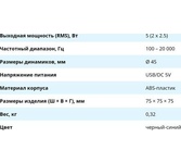 Суммарная звуковая мощность: 4.4. Основной цвет: черный. Акустический тип: 2.0. Материал корпуса колонок (фронт): пластик. Количество полос фронтальных колонок: широкополосные. Линейный вход (стерео): есть. Пульт ДУ: без пульта. Общий вес: 0.7. Отношение сигнал/шум: 85. Тип электропитания: от USB Type C. Размер широкополосного динамика (фронт): 2". Расположение регуляторов: на передней панели. Особенности: Общая мощность системы: до 4.4 Вт RMS. Пиковая выходная мощность: до 8.8 Вт. Тип карт памяти: 0. Подсветка: есть. Габариты упаковки (ед) ДхШхВ: 0.24x0.13x0.12. Вес упаковки (ед): 0.94. Длина кабеля: 1.2. Гарантия: 12 мес.. Частотный диапазон: 80 Гц - 20 КГц. Размер фронтальных колонок (ШхВхГ): 113 х 117 х 116 мм. Мощность фронтальных колонок: 2 х 2.2 Вт. Регуляторы: на передней панели. Питание: от USB Type C. Цвет: черный. Тип: 2.0. Суммарная звуковая мощность: 4.4 Вт