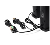 Акустическая система, суммарная выходная мощность (RMS) 6 Вт, мощность сателлитов (RMS) 2х3 Вт, размер динамиков сателлитов 2х2 ", диапазон частот 300–200000 Гц, разъем для наушников, вход для микрофона, тТип интерфейса 3,5-мм джек, питание от USB, 5 В.
