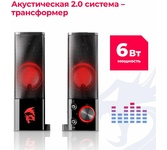 Акустическая система 2.0, выходная мощность (RMS), Вт 6 (2 х 3), частотный диапазон, Гц 80 – 20 000, размеры динамиков, мм O 60, напряжение питания USB / DC 5V, материал корпуса ABS-пластик, система совместима с PC, DVD/Media-проигрывателями, мобильными устройст- вами и др. источниками звука, питание через USB-порт ПК, ноутбука или блок питания 5V DC, регулировка уровня громкости, индикатор питания, размеры изделия, мм 76 х 175 х 72