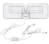 Антенна с встроенным усилителем, ДМВ и цифровое DVB-T2 телесигнал, диапазон частот 470-860 МГц, каналы 21-60, коэффициент усиления 11-18 дБи, коэффициент защитного действия 8 дБ, электропитание от антенного и USB-входа, габариты (ДхШхВ) 292х300х85 мм.