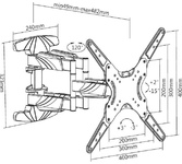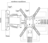 Для использования с телевизорами диагональю 23"-55", весом до 40кг. Возможен наклон до 12 градусов и подъем до 2 градусов Поворот влево и вправо на 90 градусов. Расстояние телевизора от стены 49-503мм. VESA 75x75, 100x100, 200x200, 300x300,400x400