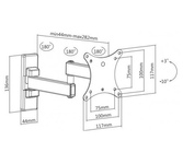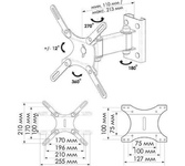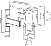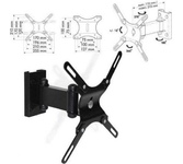 Технические характеристики: Тип: наклонно-поворотный (одно колено) Назначение: для LED/LCD/PLASMA телевизоров Цвет: черный Угол наклона: -10°/+3° Угол поворота: 180° Мин. диагональ: ТВ 13 дюймов Макс. диагональ: ТВ 27 дюймов Максимальный вес оборудования: 20 кг Тип монтажа: настенный Расстояние от стены до кронштейна: 44 -192 мм Поддержка крепления стандарта VESA: 75х75/100х100 Крепление: в комплекте