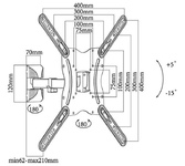 Наклонно-поворотный кронштейн. Для использования с телевизорами 13"-55" весом до 25кг. Расстояние телевизора от стены 67~199мм. VESA75x75,100x100,100x200,200x100,200x200,300x200,400x200,300x300,400x300,400x400. Возможен наклон до 15 градусов и подъем до 5 градусов. Поворот влево и вправо на 60 градусов.