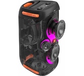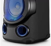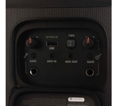Cуммарная мощность; 200 Вт (RMS); Поддерживаемые аудио форматы; MP3, WMA; Эквалайзер; есть; Разъем USB; есть; Микрофонный вход; есть; Особенности; 2.1 канал (сабвуфер::100Вт, твитер 50Вт x 2). Вход для гитары (6.3mm). Пользовательский эквалайзер - только в приложении. Колеса; Караоке; есть; Поддержка Bluetooth; поддерживается; Цвет; черный; Размеры (основной блок); 289 х 570 х 280 мм