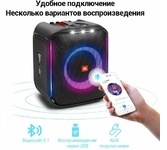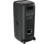 Cуммарная мощность; 200 Вт (RMS); Поддерживаемые аудио форматы; MP3, WMA; Эквалайзер; есть; Разъем USB; есть; Микрофонный вход; есть; Особенности; 2.1 канал (сабвуфер::100Вт, твитер 50Вт x 2). Вход для гитары (6.3mm). Пользовательский эквалайзер - только в приложении. Колеса; Караоке; есть; Поддержка Bluetooth; поддерживается; Цвет; черный; Размеры (основной блок); 289 х 570 х 280 мм