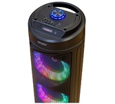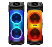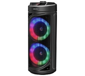 Акустика, Bluetooth, мощность - 30 Вт, диаметр динамиков - 2х165 мм, FМ-радио, МРЗ-плеер (USB, MicroSd), AUX, LEDэкран, пульт ДУ, микрофон, габаритные размеры: 230х230х650 мм.