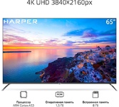 Диагональ экрана 65" (164 см)QLED(metal frameless , bridge stands) YaOS/voice assistant ANDROID 11 +BT DDR 1.5+8GB Системы цветности аналогового ТВ: SECAM, PAL Системы цветности для AV: NTSC, PAL Цифровой тюнер DVB-Т/T2/C SMARTTV Wi-Fi Bluetooth 5.0 Декодеры стереозвука NICAM, А2,АС3 Формат изображения: 16:9 Разрешение экрана 3840х2160 Динамический контраст 200000:1 Яркость 400 кд/м2 Угол обзора (гор/верт) ° 178°/178 Цифровой 3D фильтр Количество цветов 1,07млрд. Время отклика 6,5 мс Меню на русском, английском языках Аудио 2х10 Вт Входы/выходы: Антенный вход Композитный AV вход Аудио выход 3,5 мм 3 х HDMI 2 х USB CI слот LAN СОАХ Питание: Напряжение 100-240 В ~ 50/60 Гц Макс. потребляемая мощность 230 Вт Потребляемая мощность в режиме ожидания - 0,5 Вт Удельная мощность рабочего режима: 0,016 Вт/кв.см Потребляемая мощность в выключенном режиме: О Вт Размеры с подставкой: 1446х899х293мм Размеры без подставки: 1446х831х78 мм Вес: 19,1 кг VESA: 300 х 200 мм
