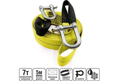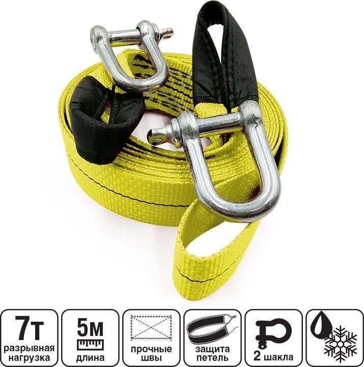 Трос буксировочный с предназначен для буксировки автомобилей и других транспортных средств. Максимальная масса буксируемого автомобиля: 7 т Длина: 5 м (в соответствии с п. 20.3 ПДД) Изготовлен из высокопрочного полиэстера Отличается износостойкостью, морозоустойчивостью и стойкостью к агрессивным средам На протяжении всего срока службы не меняет свои линейные размеры ПРАВИЛА ЭКСПЛУАТАЦИИ: Движение во время буксировки должно быть плавным, без резких рывков и торможений. Не является рывковым тросом! Следить, чтобы провисший трос не намотался на колеса. Не применять для подъёма. Максимальная масса авто: 7 т Комплектация: Скоба такелажная М14 – 2 шт.; Трос буксировочный Длина: 5 м Ширина ленты: 50 мм