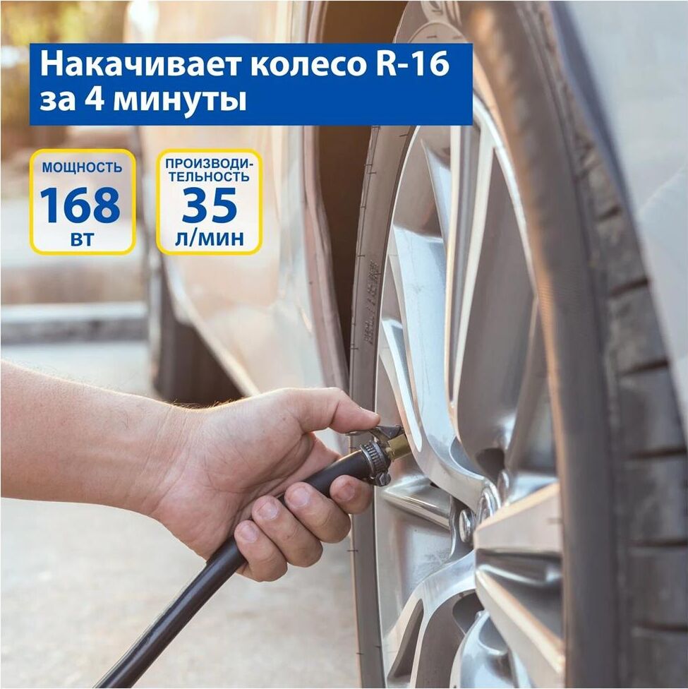 Мощность - 168 Вт, Производительность - 35 л/мин, Максимальное токопотребление - 14 А, Максимальное давление - 7 Атм, Длина провода питания: 3 м, Длина воздушного шланга: 1 м. Сумка и набор переходников в комплекте.