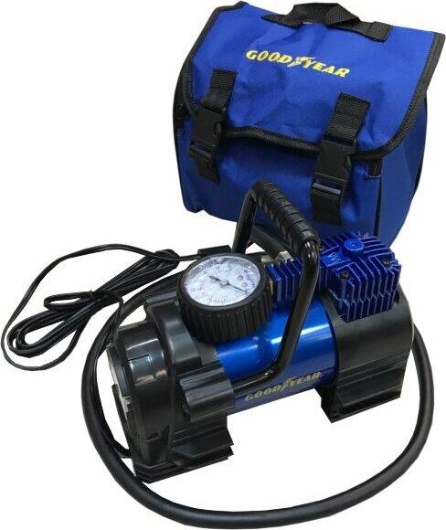 Производительность 35 л/мин, Давление до 7 атм, Для шин R13-R17, Питание 12 V, Защита флажковый предохранитель, Материал Сталь, Вес 1,9 кг, Воздушный компрессор Goodyear GY-35L LED 35 л/мин с фонарём, со съемной ручкой, сумка для хранения.