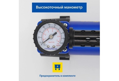 GOODYEAR GY000116 GY-45L CASE 45 л/мин Компрессор воздушный автомобильный Goodyear GY-45L/case с повышенной производительностью. Не требует обслуживания. Накачивает колесо R-16 за 3,5 минуты. Высокоточный манометр. Кейс и набор переходников в комплекте. Флажковый предохранитель в капсуле на контактном проводе. Металлический радиатор охлаждения камеры поршня. Расширенная гарантия (3 года). Оригинальный лицензированный продукт. Температура эксплуатации - -40..60°С. Время непрерывной работы - 30 минут.