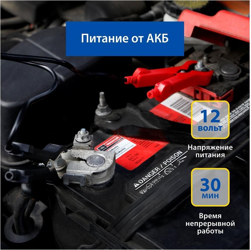 Воздушный компрессор Goodyear GY-80L 80 л/мин, двухпоршневой, питание от АКБ, съемный витой шланг, сумка для хранения Устройство отлично справляется с накачиванием колес джипов, внедорожников, минивэнов, микроавтобусов и небольших грузовиков, а также надувных лодок. В комплект входит набор переходников. Производительный компрессор питается от клемм аккумулятора 12В. Он может беспрерывно работать в течение 30 минут, а с колесом R-16 справляется за 2 минуты. Модель GY-80L оснащена съемным витым шлангом, на конце которого расположен коннектор к ниппелю колеса в виде удобной металлической защелки. За счет этого процесс присоединения компрессора становится практически мгновенным и не требует усилий. Двухпоршневой компрессор поставляется в прочной сумке, что позволяет компактно хранить инструмент в багажнике автомобиля. " Вес: 3,8 кг " Длина провода питания: 3 м " Длина витого шланга: 5 " Габариты ДхШхВ: 290х195х220 мм