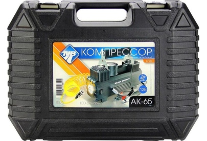 Мощность – 180 Вт. Максимальная сила тока – 20 А. Максимальное давление – до 10 кг/см2 (140PSI/10 Bar) Производительность – до 65 л/мин. Шнур питания – 2,8 м. Воздушный шланг – 5 м. Встроенный LED-фонарь Подключение к клеммам АКБ при помощи металлических зажимов Комплект насадок-переходников – 3 шт. Пластиковый кейс. Цвет- черный. Напряжение питания — 12В. Состав: металл,пластик