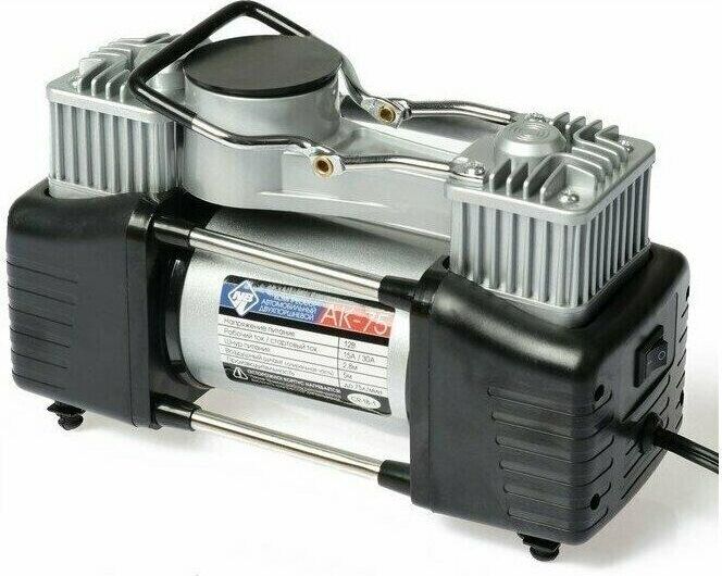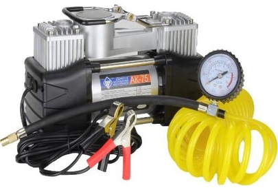 Мощность – 180 Вт. - Максимальная сила тока – 20 А. - Максимальное давление – до 10 кг/см? (150PSI/10Bar) - Производительность – до 75 л/мин. - Шнур питания – 2,7 м. - Воздушный шланг – 5м. - Пластиковый кейс для хранения и переноски - Подключение к клеммам АКБ при помощи металлических зажимов - Комплект насадок-переходников – 3 шт. -Набор дорожного инструмента Цвет- серебро Напряжение питания - 12В. Состав:металл, пластик